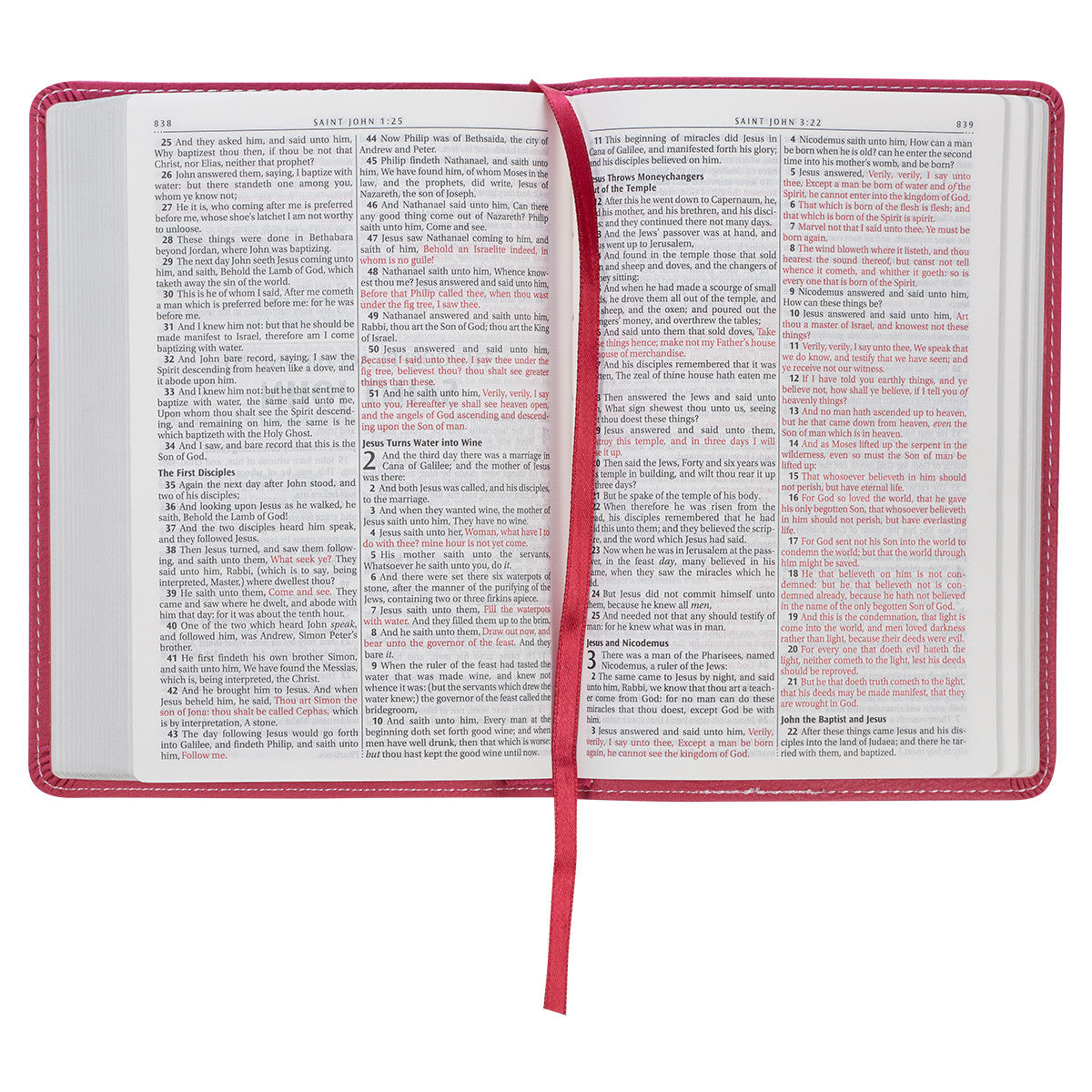 White topstitching along the edges of the Bible adds strength and durability to a beautiful design. On the spine, the title appears in silver foil and the version reference is printed in petal pink ink. Silver gilt-edged pages complement the silver foil on the cover. A coordinating pink satin ribbon marker adds to the allure of this compact Bible.