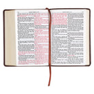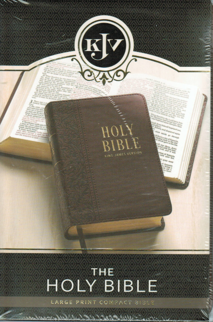 The 10-point type text size of the Medium Brown Faux Leather Large Print Compact King James Version Bible makes it an easy-to-read yet highly portable Bible. Although the Bible itself is much smaller than a standard Bible, the 10-point type text is slightly larger. The medium brown faux leather cover is heat-debossed with a continuous fern leaf design that starts on the back cover and wraps around the spine where it is attached to a smooth front panel with a double row of brown topstitching. The smooth panel on the front holds the gold-foiled title and version reference.