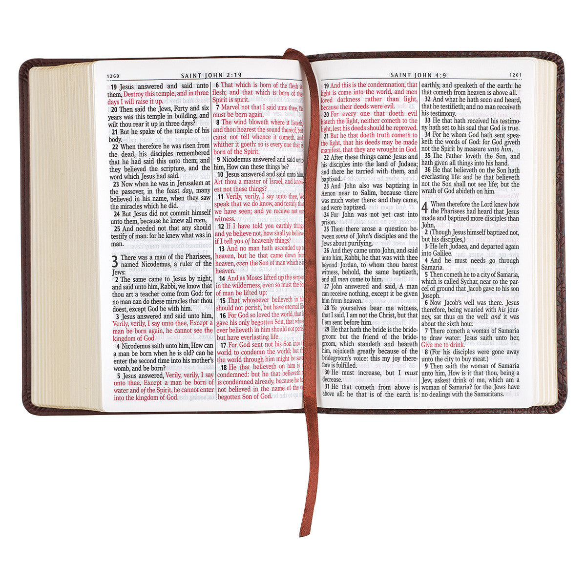 Gilt-edging on the page edges and the coordinating brown satin ribbon marker adds to the beauty of this compact Bible and complements the beautiful poetic language of the classic 1769 King James Version with its beautiful poetic language-still considered one of the most accurate word-for-word translations even after 400 years. The Bible opens flat due to its Smyth-sewn lay-flat binding.
