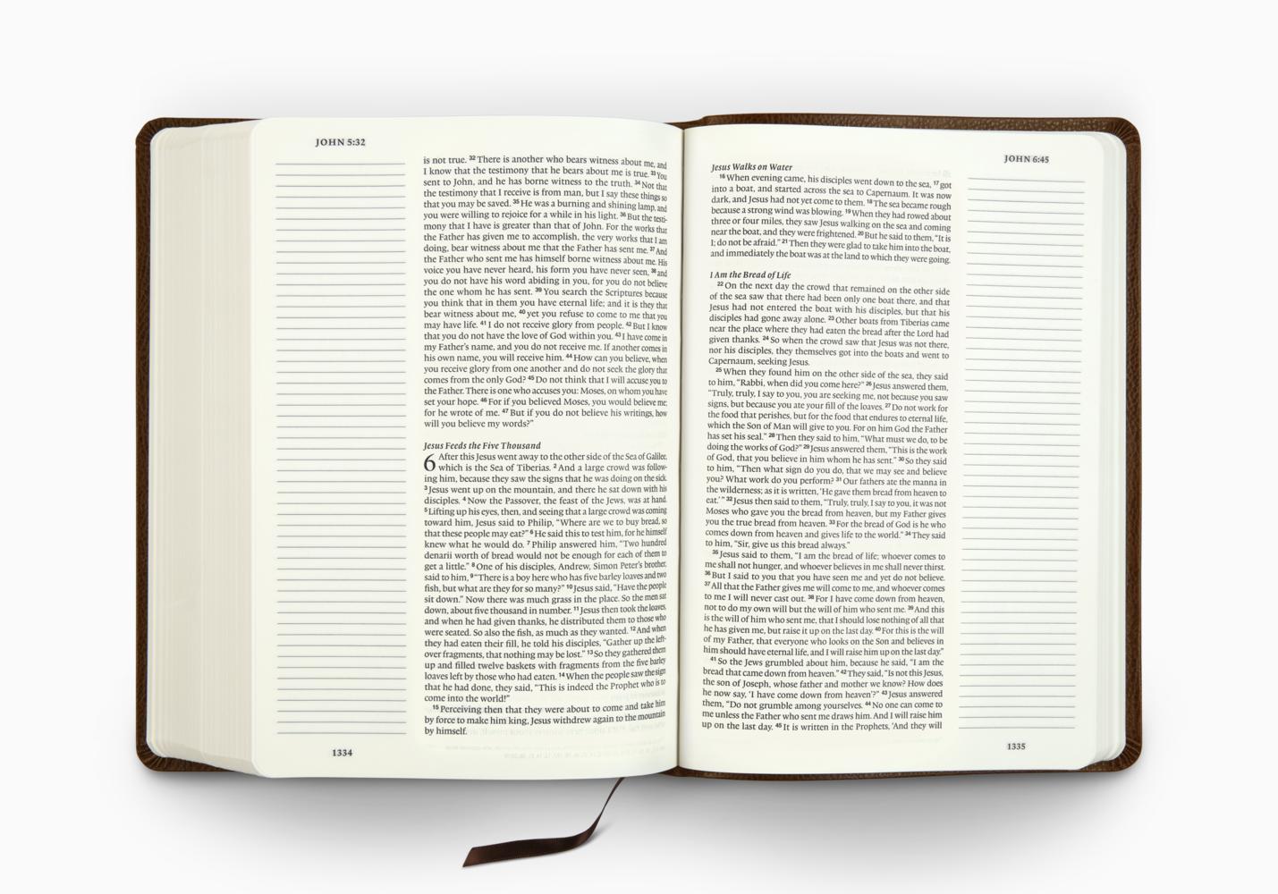 The ESV Single Column Journaling Bible, Large Print features the same high-quality Bible paper and two-inch ruled margins as the original ESV Single Column Journaling Bible, but now with larger, 9.5-point type. This new edition is perfect for those seeking a large-print Bible with plenty of space for notes, prayers, reflections, or artwork.